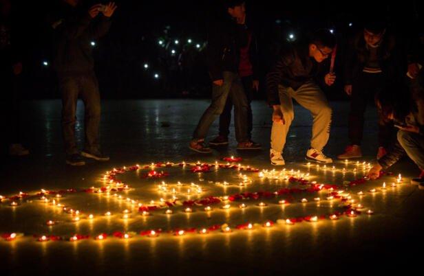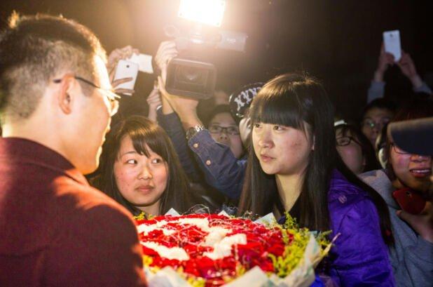 “初次见面就占据我心中,部署星空只为了你等候……”前晚7点半,伴随一首《我会很爱你》,武汉纺织大学内,一名穿着暗红色西装外套、戴着黑框眼镜的男生单膝跪地,向一名女生递上玫瑰花束,围观的百余名学生纷纷举起手机打开闪光灯,充当“灯光师”(如图)。
