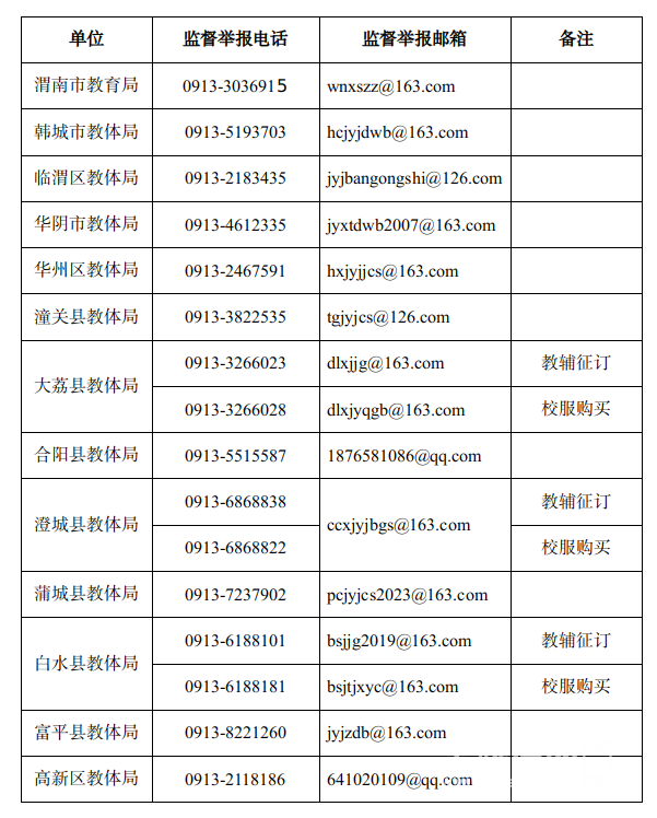 为进一步规范全市教辅征订和校服购买工作,坚决整治教育领域群众身边不正之风和腐败问题,切实维护学生的合法权益,畅通反映渠道,现将渭南市教辅征订和校服购买谋利问题举报电话予以公布。欢迎广大师生、家长和社会各界群众积极参与监督。 一、整治内容 (一)利用征订教辅谋利问题 1.纠治违反中小学教辅材料选用“五限原则”(限年级、限学科、限数量、限范围、限容量),征订《陕西省教学用书目录》外教辅材料的行为; 2.纠治违反“一科一辅”和自愿购买原则,强迫或变相强迫学生和家长订购教辅材料的行为; 3.纠治学校、教师、其他单位或个人在学校宣传、推荐、推销、组织学生购买或变相组织购买除《陕西省教学用书目录》外的教材、教辅材料的行为; 4.严肃查处单位或个人从学校统一代购的《陕西省教学用书目录》内的中小学教辅材料中谋利的行为; 5.按照“凡进必审”“谁推荐谁负责”“谁选用谁负责”原则,纠治未经过审核、遴选的课外读物进入校园的行为。 (二)利用购买校服谋利问题 1.纠治学校在校服采购中违反“三重一大”议事决策制度,擅自确定供应商、规避招投标程序指定生产企业、虚增采购数量套取资金等违规行为; 2.纠治学校以“统一着装”名义强制购买、频繁更换校服款式,采购明显高于市场均价的校服等加重家长经济负担行为。 3.严肃查处校服质量检测流于形式、安全指标不达标却予验收通过等失职渎职和师德师风失范问题。 4.严肃查处学校和教师在校服款式选定、质量验收等环节收受企业礼品礼金、接受宴请和旅游安排等利益输送问题。 二、监督举报方式 为确保不发生遗漏,请在反映问题时主要通过电子邮件形式详细说明有关情况,并附相关旁证材料。 渭南市教育局 2025年4月14日 来源:渭南市教育局